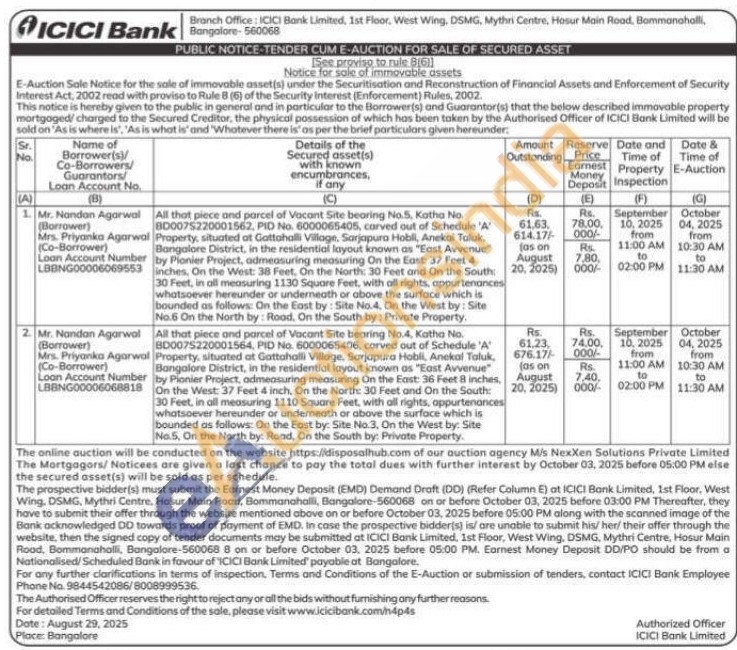 All that piece and parcel of Vacant Site bearing No.4, Katha No. BD007S220001564, PID No. 6000065406, carved out of Schedule 'A' Property, situated at Gattahalli Village, Sarjapura Habli, Anekal Taluk, Bangalore District, in the residential layout known as "East Avvenue by Pionier Project, admeasuring measuring On the East: 36 Feet 8 inches, On the West: 37 Feet 4 inch, On the North: 30 Feet and On the South: 30 Feet, in all measuring 1110 Square Feet, with all rights, oppurtenances whatsoever hereunder or underneath or above the surface which is bounded as follows: On the East by: Site No.3, On the West by: Site No.5, On the North by: Road, On the South by: Private Property