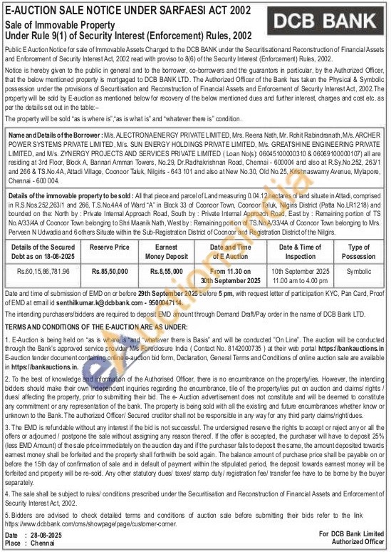 Details of the immovable property to be sold: All that piece and parcel of Land measuring 0.04.12 hectares of land situate in Attadi, comprised in R.S.Nos.252.263/1 and 266, T.S.No.4A4 of Ward "A" in Block 33 of Coonoor Town, Coonoor Taluk, Nigiris District (Patta No LR1218) and bounded on the: North by: Private Internal Approach Road, South by Private Internal Approach Road, East by: Remaining portion of TS No. A/33/4A of Coancor Town belonging to Shri Maanik Nath, West by: Remaining portion of TS. No.A/33/4A of Cooncor Town belonging to Mrs. Parveen N Udwadia and 6 others Situate within the Sub-Registration District of Coonoor and Registration District of the Nilgirs