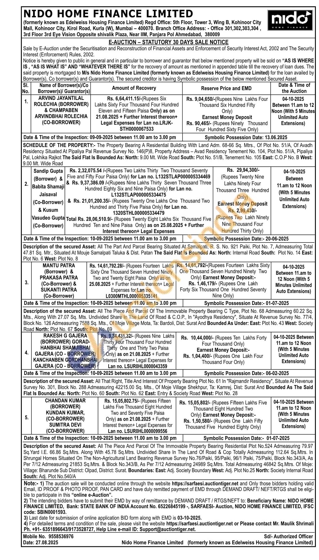 SCHEDULE OF THE PROPERTY:- The Property Bearing A Residential Building With Land Adm. 68-66 Sq. Mtrs., Of Plot No. 51/A, Of Avadh Residency Situated At Pipaliya Pal Revenue Survey No. 146(P)8, Property Address - Avad Residency Tenement No. 104, Plot No. 51/A, Pipaliya Pal, Lokhika Rajkot The Said Flat Is Bounded As: North: 9.00 Mt. Wide Road South: Plot No. 51/B, Tenement No. 105 East: C.O.P No. B West: 9.00 Mt. Wide Road
