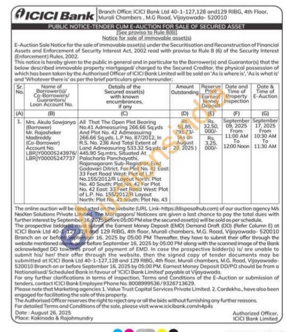 All That The Open Plot Bearing No.41 Admeasuring 266.66 Sqyds And Plot No. 42 Admeasuirng 266.66 Sqyds, L.P No. 87/2012, In R.S. No. 236 And Total Extent of Land Admeasuring 533.32 Sqyds or Rajanagaram Sub-Registrar, East 445.90 Sq.mtrs, Situated At Palacharia Panchayathi, Godavari Ditrict. For Plot No. 41 East: 33 Feet Road West: Plot of LP. No.155/2012/R Layout North: Plot No. 40 South: Plot No. 42 For Plot No. 42 East: 33 Feet Road West: Plot of LP. No. 155/2012/R Layout North: Plot No. 41 South: Plot No. 43