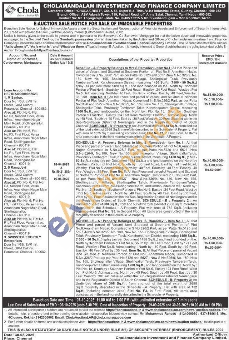 All that Piece and parcel of Vacant land Situated at Southern Portion of Plot No. 6. Anantham Nagar, Comprised in S.No.326/2 Part, as per Patta No.3126 and 5527-New S.No.326/9, No. 189, New No. 155, Sholinganallur Village, Shotingallur Taluk, Previously Tambaram Taluk. Kancheepuram District, measuring 1450 Sq.ft.. (1500-50 Sq.ft.,) splay (as per Document 1488 Sq.ft.) and land bounded on the North by Northern Portion of Plat No.6, South by: 30 Feet Road, East by: 24 Feet Road, Westhy Plot No.5, Admeasuring North by: 40 Feet, South by: 40 Feet, East by: 40 Feet, West by: 35 Font. Item No. II: All that Piece and parcel of Vacant land Situated at Northern Portion of Plot No.6. Anantham Nagar, Comprised in S.No.326/2 Part, as per Patta No.3126 and 5527-New 5.No.326/9, No. 189, New No. 155, Shalinganallur Village, Sholingallur Taluk, Previously Tambaram Taluk Kancheepuram District, measuring 1200 Sq.ft., and landbounded on the North by: Plot No. 15. South by Southem Portion of Plot No.6, Eastby: 24 Feet Road, West by: Plot No.S. Admeasuring: North by: 40 Feet, South by :40 Feet, East by: 30 Feet, West by: 30 Feet. Situated within the Sub-Registration District of Neelangarai and in the Registration District of South Chennai SCHEDULE B: Property 3: An Undivided share of 308 Sq.ft., from and out of the total extent of 2688 Sq. ft., marefully described in the Schedule A Property. Flat with area of 752 Sq.ft., (including common area) Flat No. F3, in First Floor, All Items area constructed in the landmorefully described in the Schedule-A Property