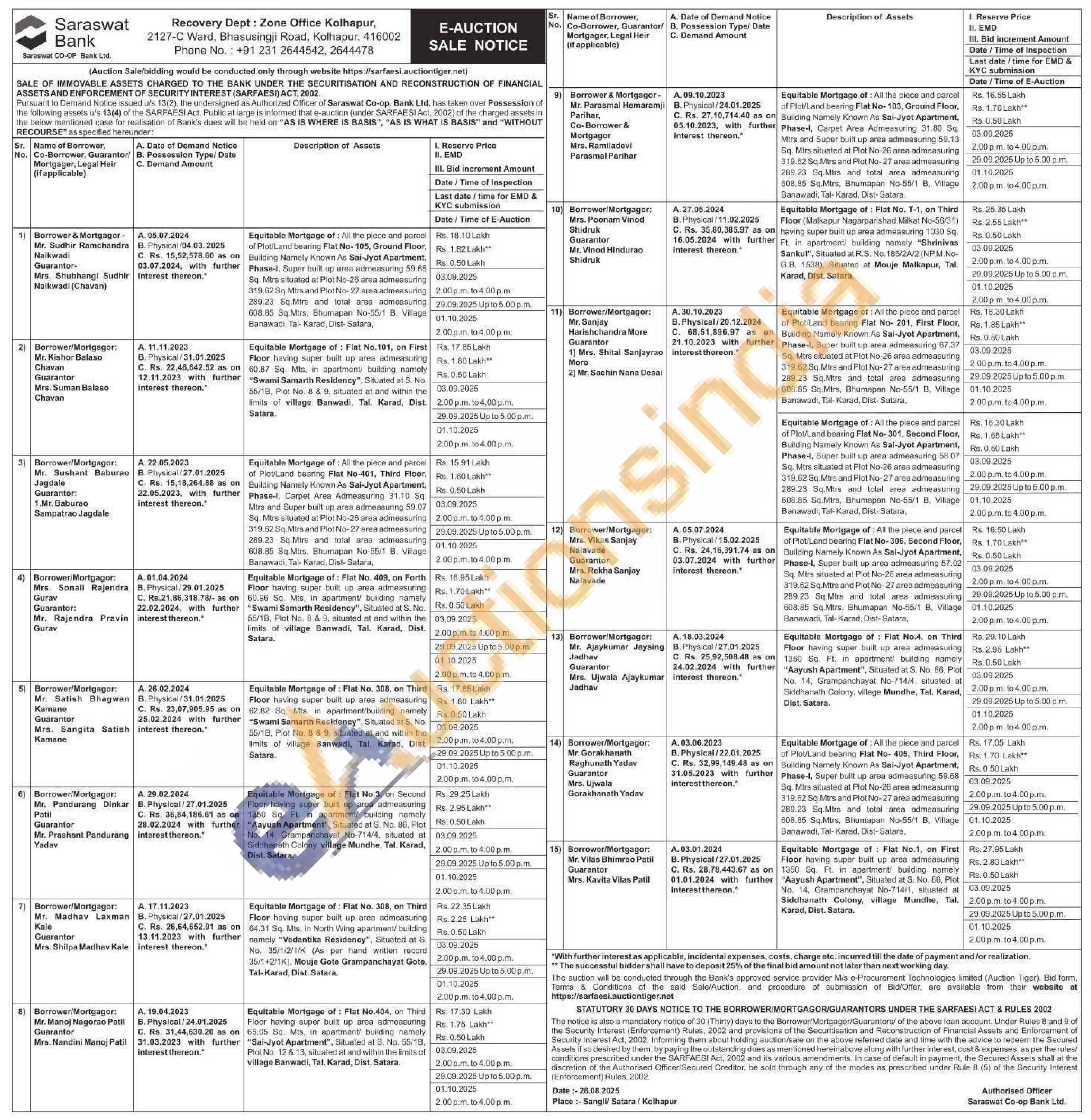 Equitable Mortgage of: Flat No. 409, on Forth Floor having super built up area admeasuring 60.96 Sq. Mts, in apartment/ building namely "Swami Samarth Residency", Situated at S. No. 55/1B, Plot No. 8 & 9, situated at and within the limits of village Banwadi, Tal. Karad, Dist. Satara.