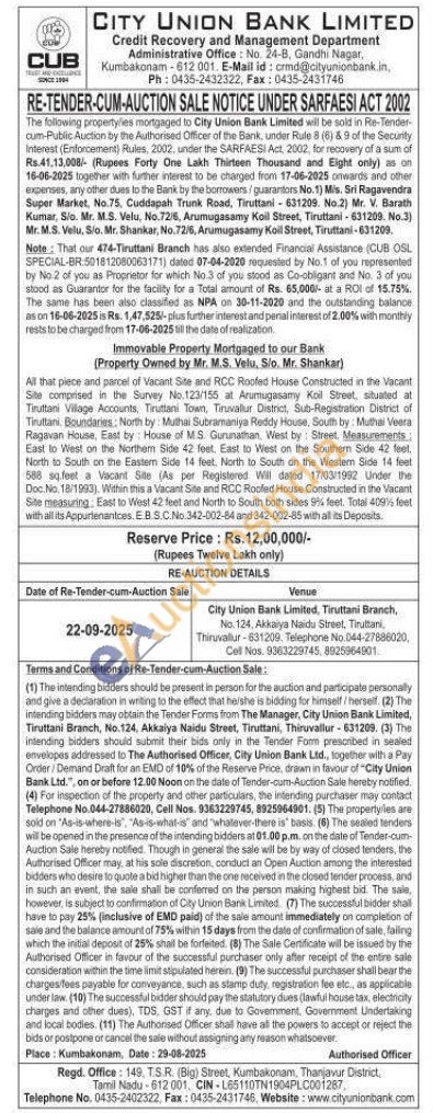 All that piece and parcel of Vacant Site and RCC Roofed House Constructed in the Vacant Site comprised in the Survey No.123/155 at Arumugasamy Koil Street, situated at Tiruttani Village Accounts, Tiruttani Town, Tiruvallur District, Sub-Registration District of Tiruttani. Boundaries: North by: Muthai Subramaniya Reddy House, South by Muthar Veera Ragavan House, East by House of M.S. Gurunathan, West by: Street, Measurements East to West on the Northem Side 42 feet. East to West on the Southem Side 42 feet, North to South on the Eastem Side 14 feet. North to South on the Western Side 14 feet 588 sq.feet a Vacant Site (As per Registered Will dated 17/03/1992 Under the Doc. No. 18/1993). Within this a Vacant Site and RCC Roofed House Constructed in the Vacant Site measuring East to West 42 feet and North to South both sides 9% feet. Total 409% feet with all its Appurtenantces. EBS.C.No.342-002-84 and 342-002-85 with all its Deposits.