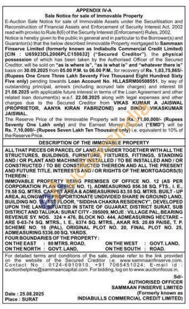 IMMOVABLE PROPERTY BEING PREMISES OF OFFICE NO. 12 (AS PER CORPORATION PLAN OFFICE NO. 1), ADMEASURING 856.38 SQ. FTS., I. E., 79.58 SQ. MTRS, CARPET AREA & ADMEASURING 83.55 SQ. MTRS. BUILT-UP AREA, ALONGWITH PROPORTIONATE UNDIVIDED SHARE IN GROUND LAND, BUILDING NO. 'B', 1ST FLOOR, SIDDHA CHAKRA RESIDENCY", DEVELOPED UPON THE LAND SITUATED IN STATE OF GUJARAT, DISTRICT SURAT, SUB DISTRICT AND TALUKA: SURAT CITY-395009, MOJE: VILLAGE PAL, BEARING REVENUE SY. NOS. 324+476, BLOCK NO. 444, ADMEASURING HECTARE -ARE 0-63-74 SQ. MTRS., I. E., 6374 SQ. MTRS., AKAR RS. 20.69 PAISE, T. P. SCHEME NO. 16 (PAL), ORIGINAL PLOT NO. 20, FINAL PLOT NO. 25, ADMEASURING 5336.00 SQ. YARDS.