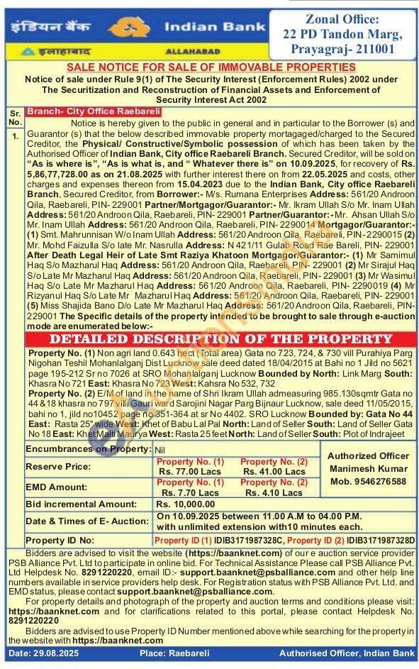 E/M of land in the name of Shri Ikram Ullah admeasuring 985.130sqmtr Gata no 44 & 18 khasra no 797 vill. Gauri ward Sarojini Nagar Parg Bijnaur Lucknow, sale deed 11/05/2015, bahi no 1, jild no10452 page no 351-364 at sr No 4402. SRO Lucknow Bounded by: Gata No 44 East: Rasta 25" wide West: Khet of Babu Lal Pal North: Land of Seller South: Land of Seller Gata No 18 East: Khet Malti Maurya West: Rasta 25 feet North: Land of Seller South: Plot of Indrajeet