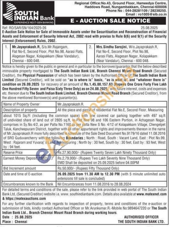 about 1015 Sq.Ft (Including the common space) with one covered car parking together with 497 sq.ft of undivided share of land out of 2805 sq.ft, in Plot Nos 98 and 106 Eastern Portion, in Azhagesan Nagar. comprises in Sy.No.4/2, as per Patta No.1160 as per patta New S No. 4/12 of Kolapakkam Village, Chengelpet Taluk, Kancheepuram District, together with all other appurtenant rights and improvements thereon in the name of Mr.Jayaprakash. R more fully described in schedule of the Sale Deed Document No.9179/16 dated 11.08.2016 of SRO Guduvancherry with the following Boundaries: North Road, South: Vacant Land, East: Plot No.99, West: Rajaram and Yuvaraj' s Land. Admeasuring: North by: 30 feet, South by: 30 feet, East by: 93 feet, West by: 94 feet