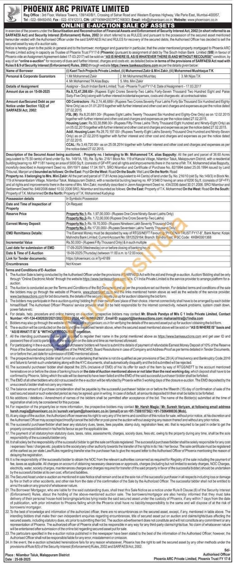 Description of the Secured Asset being auctioned.: Property no. Il belonging to Mrs. Mini Zakir: All the part and parcel of 17.81 Acres (equivalent to 44 Cents) of land under Sy. No. 216/10 (old Sy. No. 149/3) in Block No. 119 of Amarambalam Village, Nilambur Taluk, Malappuram District, with a residential building bearing no. KP 3/346 D having an area of 6200 Sq.ft. (consists of GF+FF) and all rights and improvements there in the name of Mrs. Mini Zakir, morefully described in Jenm Assignment Deed no. 434/2006 dated 30.01.2006. SRO Nilambur and Settlement Deed No. 648/2006 dated 10.02.2006 SRO, Nilambur and bounded as follows: On the East: Property of T.K. Mohammed On the West: Road On the South: Property of T.K. Mohammed On the North: Property of T.K. Mohammed Kudiyirup