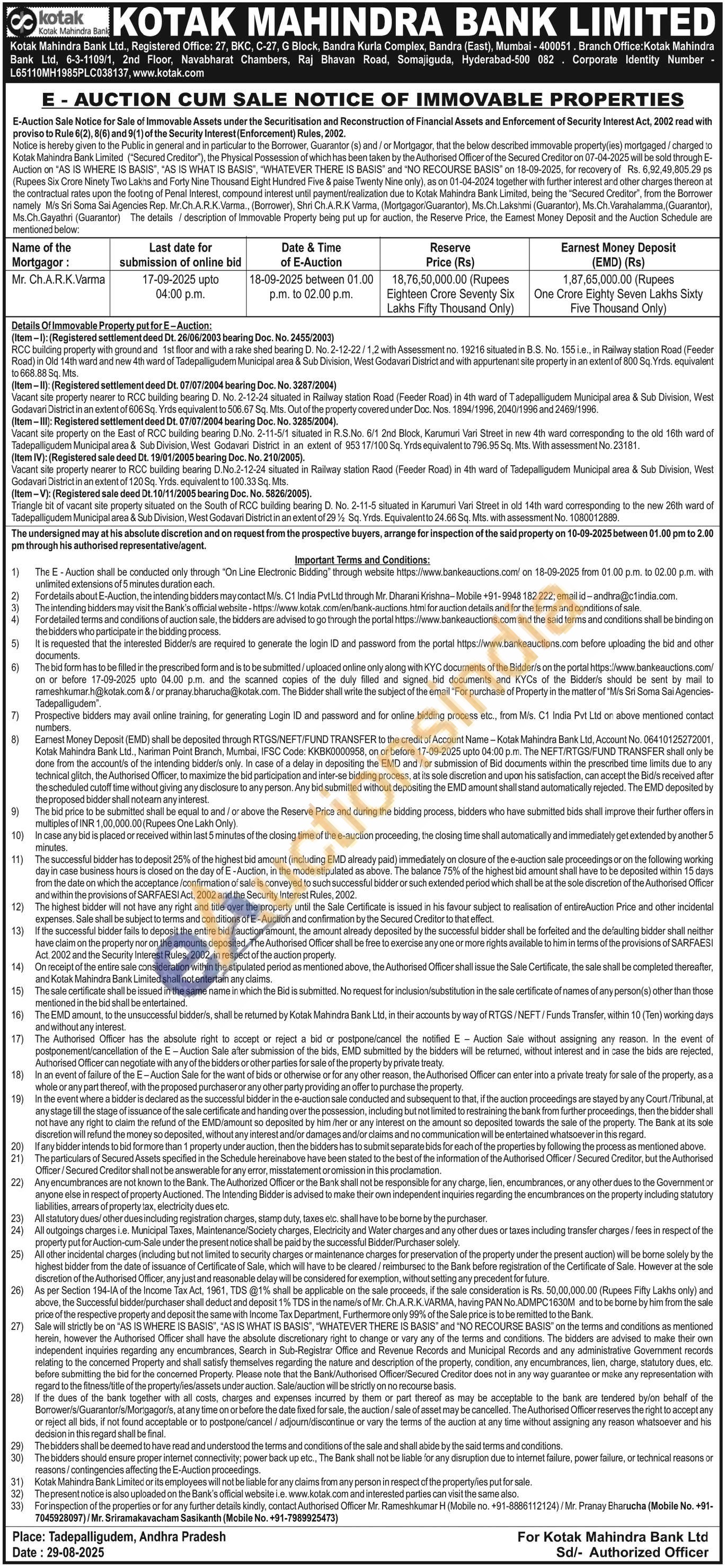 Authorised Officer Mr. Rameshkumar H (Mobile no : +91-8886112124)/Mr. Pranay Bharucha (Mobile No. +91-7045928097) / Mr. Sriramakavacham Sasikanth (Mobile No : +91-7989925473)
