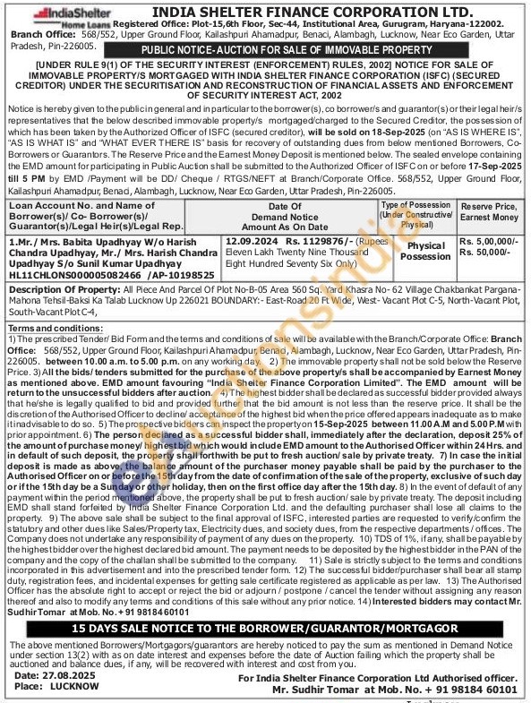 Description Of Property: All Piece And Parcel Of Plot No-B-05 Area 560 Sq. Yard Khasra No-62 Village Chakbankat Pargana-Mahona Tehsil-Baksi Ka Talab Lucknow Up 226021 BOUNDARY:- East-Road 20 Ft Wide, West-Vacant Plot C-5, North-Vacant Plot, South-Vacant Plot C-4