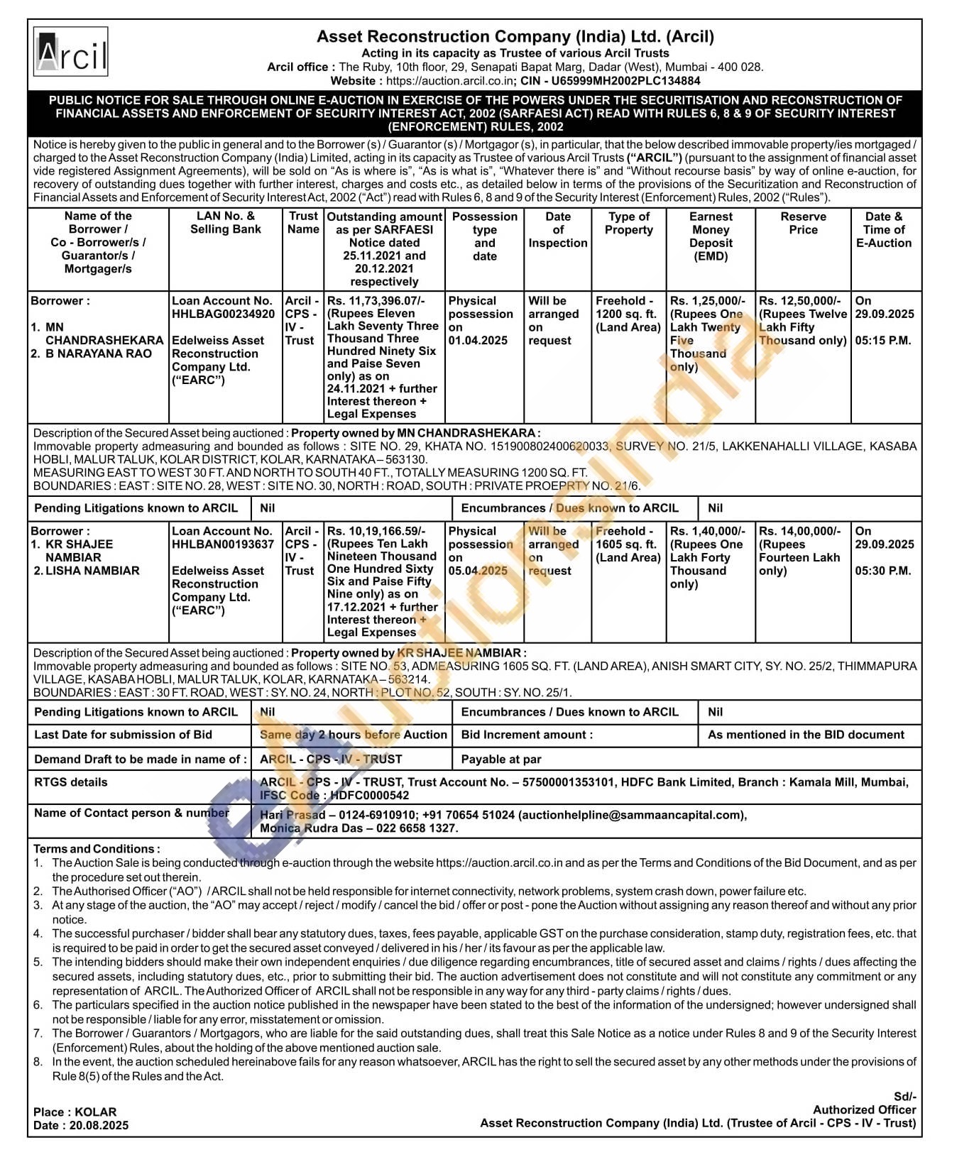 Immovable property admeasuring and bounded as follows: SITE NO. 53, ADMEASURING 1605 SQ. FT. (LAND AREA), ANISH SMART CITY, SY. NO. 25/2, THIMMAPURA VILLAGE, KASABAHOBLI, MALUR TALUK, KOLAR, KARNATAKA-563214.