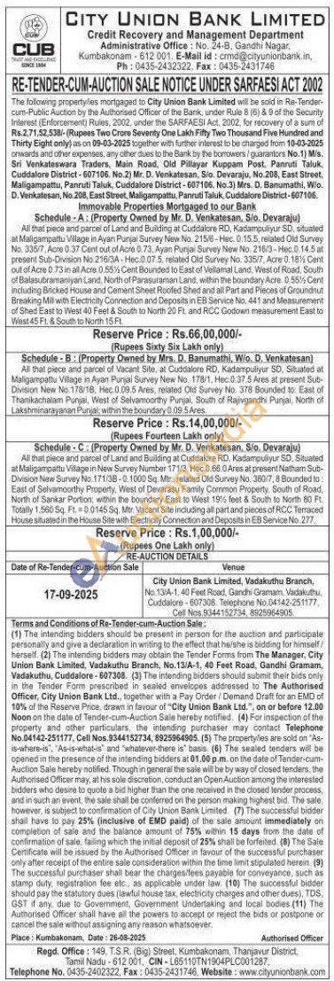 Immovable Properties Mortgaged to our Bank : Schedule C: (Property Owned by Mr. D. Venkatesan, Sio. Devaraju) : All that piece and parcel of Land and Building at Cuddalore RD, Kadampuliyur SD, Situated at Maligampattu Village in New Survey Number 171/3, Hec.0.66.0 Ares at present Natham Sub-Division New Survey No. 171/38-0.1000 Sq. Mtr., related Old Survey No. 380/7, 8 Bounded to: East of Selvamoorthy Property, West of Devarasu Family Common Property, South of Road, North of Sankar Portion; within the boundary East to West 19% feet & South to North 80 Ft. Totally 1,560 Sq. Ft. 0.0145 Sq. Mtr. Vacant Site Including all part and pieces of RCC Terraced House situated in the House Site with Electricity Connection and Deposits in EB Service No. 277.