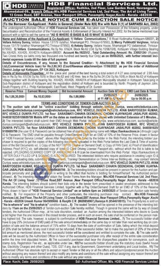 Details of Immovable Properties: All the piece and parcel of the land having a total extent of 4.27 ares comprised of 2.85 Ares lies in Re. Sy No. 61(Old Sy. No. 10/9) in Block No.62 and 1.42 Ares lies in Re. Sy. No 24 (Old Sy No. 10/8), in Block No.62 of Kottayam Village together with Building bearing No. XIII/425, XIII/426, XIII/427A of Kottayam Muncipality situated in Kottayam Taluk, lying in Sub-Registraion district of Kottayam and the registration district of Kottyam and is bounded by North: Property of Jaymon John, South Property of K.J. Philip Kandarapallil, East Road, West: Property of Dr. Suresh