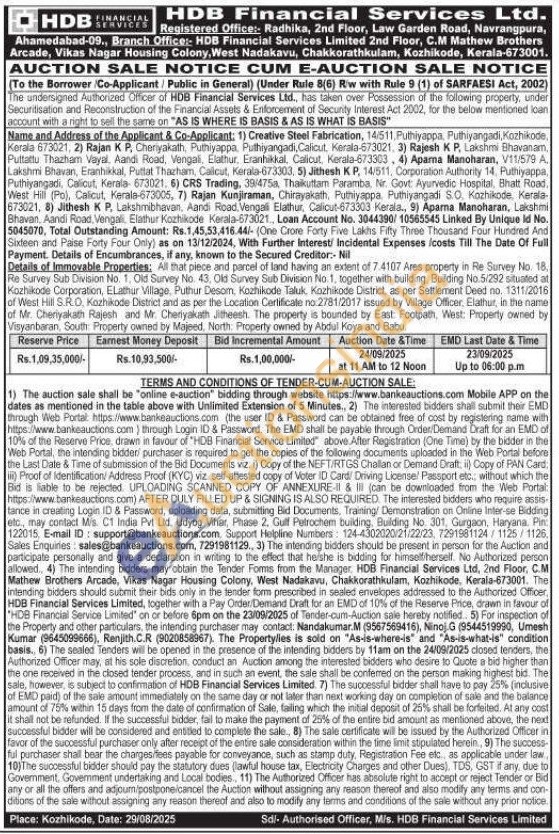 Details of Immovable Properties: All that piece and parcel of land having an extent of 7.4107 Ares property in Re Survey No. 18, Re Survey Sub Division No. 1, Old Survey No. 43, Old Survey Sub Division No. 1, together with building, Building No.5/292 situated at Kozhikode Corporation, ELathur Village, Puthur Desom, Kozhikode Taluk Kozhikode District, as per Settlement Deed no. 1311/2016 of West Hill S.RO, Kozhikode District and as per the Location Certificate no 2781/2017 issued by Village Officer, Elathur, in the name of Mr. Cheriyakath Rajesh and Mr. Cheriyakath Jitheesh. The property is bounded by East: Footpath, West: Property owned by Visyanbaran, South: Property owned by Majeed, North: Property owned by Abdul Koya and Babu