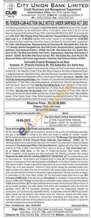 An Extent of 128 15 Sq yards of Land along with a Daba and Tiled House therein, Bearing Door Number 52-1-59, Ward No. 22 with T.S.No.540, Bhanu Street, to the West of Narasimha Road, in Jagannadhapuram, Narasimha Road, Kakinada Munopal Corporation Area, Kakinada Urban Mandal, Kakinada Sub-Registration Office, East Godavari District Bounded by Item No. 1 for 110.97 Sq. Yards along with Daba: East Property of V Suryakumari Some Extent and Item No.2 Some Extent: 47 Feet. West: Site of Nancharamma 47 Feet, North Site of B. Venkata Ratnam: 33.6 Feet, South Road: 21.3 Feet Item No.2 for 5.08 Sq. Yards: East Item No.3:3 Feel, West Item No.1.3 Feet, North, Site ofB. Venkata Ratnam: 15.3 Feet, South: Wall of Vila Surya Kumari: 15.3 Feet. Item No.3 for 10.4 Sq. Yards: East: Site of S. Appa Rao: 47 Feet, West: Wall of Vila Surya Kumari and Some Extent and Item No.2 Some Extent: 47 Fest, North: Site of Batchu people: 2 Feet, South: Road: 2 Feet. Within the above Boundaries an Extent of 126 14 Sq. Yards of Land along with a Daba House with all usufruct, Water, Ways with all Easement Rights