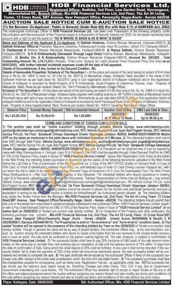 - All the piece and parcel of the land having an extent of 8.43 Ares lying in Re Sy No. 548/6 in block no. 24 (Old Sy. No. 383/10) of Manarkkad village, Kottayam Taluk recorded in the name of Mr. Satheesh Krishnan as per Sale Deed No. 423/2010 Lying in Sub registration district of Kottayam Additional and in the registration District of Kottayam is bounded by North-Property of KR Krishnakutty, South-Property of Leelamma Thomas East Property of Maliyekkal, West- Road as per location Sketch No. 1541/17issued by Mannarkadu Village Officer Schedule of The Securities II: All the piece and parcel of the land having an extent of 5.86 Ares lying in Re. Sy. No. 548/6-4 in block No. 24(Old Sy. No. 383/10) of Manarkkad village, Kottayam taluka together with building bearing no. MP 16/405 A situated at Manarkkad Grama Panchayth along with right of way recorded in the name of Mr. Krishnankutty as per sale deed 424/2010 Lying in Sub registration district of kottayam Additional and in the registration District of kottayam is bounded by North-Panchayat Road, South-Property of Satheesh. Krishnan, East-Property of Jessy kappalumakkal, West-Road as per location Sketch No. 1543/17 Issued by Mannarkad Village Officer.