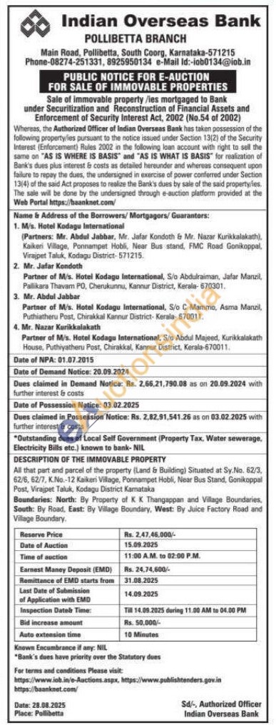 All that part and parcel of the property (Land & Building) Situated at Sy, No. 62/3, 62/6, 62/7, K.No.-12 Kaikeri Village, Ponnampet Hobli, Near Bus Stand, Gonikoppal Post, Virajpet Taluk, Kodagu District Kamataka Boundaries: North: By Property of K K Thangappan and Village Boundaries, South: By Road, East: By Village Boundary, West: By Juice Factory Road and Village Boundary