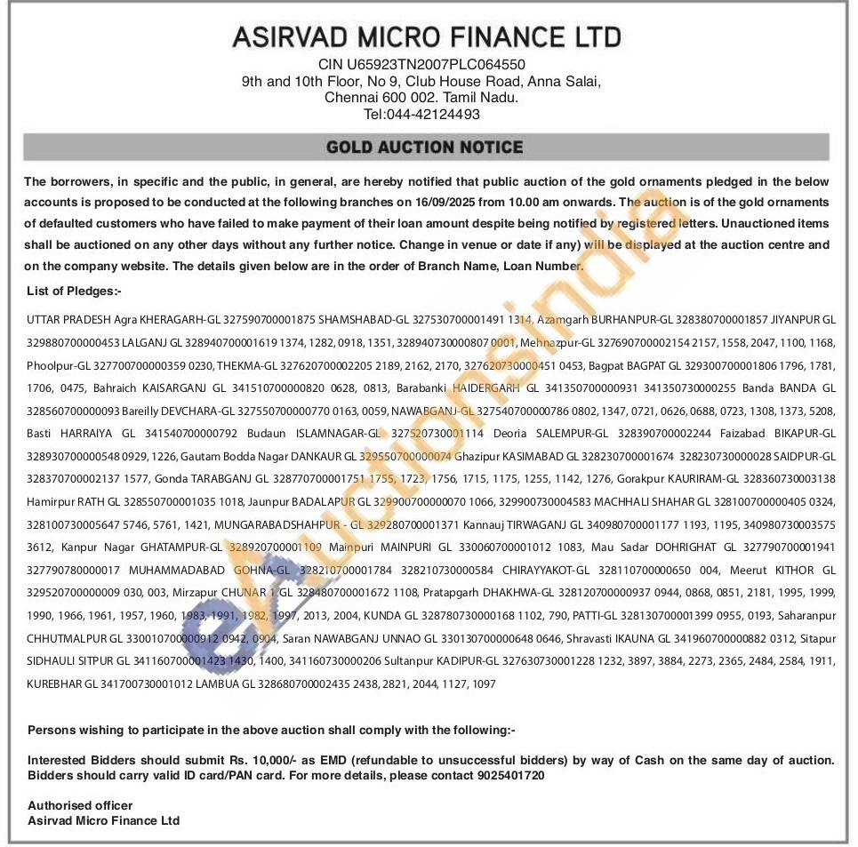 Asirvad Micro Finance Ltd Gold Auctions Auction in Agra