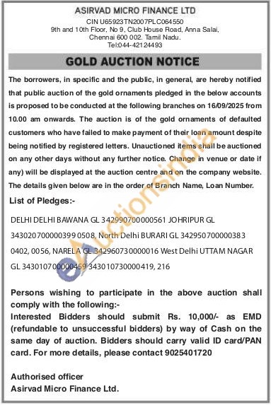Asirvad Micro Finance Ltd Gold Auctions Auction in New Delhi