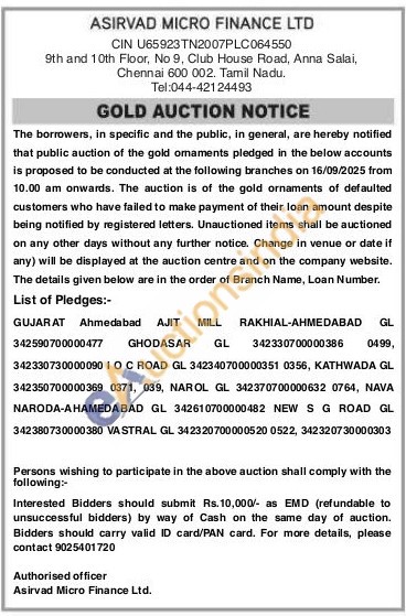 Asirvad Micro Finance Ltd Gold Auctions Auction in Ahmedabad
