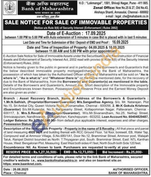 Description of the Immovable Property: Property in the name of S Revathy: All that piece and parcel of land measuring 4920 sq.ft and building thereat with RCC Ground Floor, 1st floor, borewell, EB, Water Tap, Compound wall at Ammoor Village, S.No 680/1A1, Door No. 12. Bramminar Street. Ammoor post, Walajah Taluk, Ranipet District bounded as North: T.Thiyagaran plot, South: Bramminar Street, East: NTL Kanthan House, West: Bengaloran Plot. Measuring East West both sides 41 feet, North South both Side 120 feet