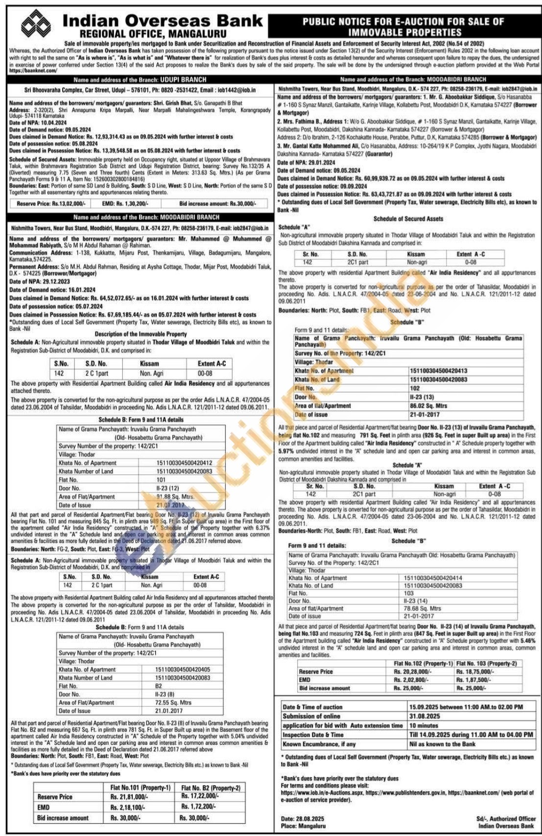 All that piece and parcel of Residential Apartment/flat bearing Deer No. 11-23 (13) of Iruvailu Grama Panchayath, being flat No.102 and measuring 791 5. Feet in pirth as (926 Sq. Feet in super Bulll up area) in the first Floor of the Apartment building called "Air India Residency constructed in A Schedule property together with 5.07% undivided interest in the "A schedule land and open car parking area and interest in common ansas. comimon amenities and facilities.