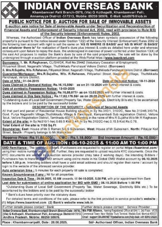 All that part and parcel of Residential House Building situated in Sy No. 310/1, 310/2C, New No.310/46,310/74, Govt. Punja Naganathi Village, Thuthikkadu Village & Panchayat, Kaniyambadi Sub registration District, Vellore Taluk, Vellore Registration District, Tamilnadu-632113 Standing in the name of Mrs. R Sujatha Wio Mr. R Raghavan Extent of the site: In Sy. No310/1-hec.0.69.5 Kist 3.44: In Sy No.310/20-hec. 0.15.5 Kist Rs.0.76. Total Extent of the site is 1155 Sq. Ft Boundaries: East: House of Mr.S Raman Sio S Subramani, West: House of Mr. Subramani, North: Pillaiyar Koil Street, South: Property belongs to Mr.Manickam