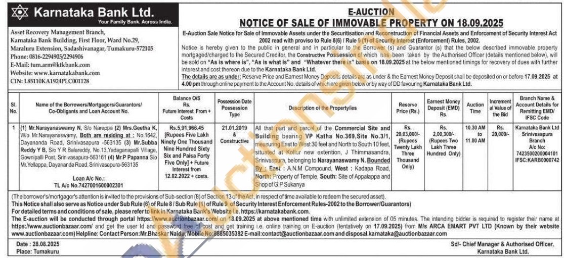 All that part and parcel of the Commercial Site and Building bearing VP Katha No.369, Site No.3/1, measuring East to West 30 feet and North to South 10 feet, situated at Kollur new extention, J Thimmasandra, Srinivaspura, belonging to Narayanaswamy N. Bounded By: East: A.N.M Compound, West: Kadapa Road, North: Property of Temple, South: Site of Appalappa and Shop of G.P Sukanya