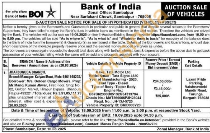 Make: Tata Motor Ltd. Model Name-Tata Signa 4830 Year of Manufacturing 2023, Fuel Type-Diesel Type of Body-Tipper Body Engine No.: B67B62300005132064313794 Chasis No.: MAT566006P3H23044 Regd. No.: JH-13J-5725 Vehicle Property ID: BKID000V23