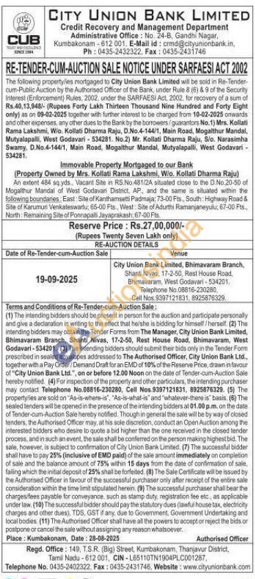 Property Owned by Mrs. Kollati Rama Lakshmi, W/o. Kollati Dharma Raju) An extent 484 sq.yds., Vacant Site in RS.No 481/2A situated close to the D.No.20-50 of Mogalthur Mandal of West Godavan District, AP, and the same is situated within the following boundaries: East: Site of Kanthamsetti Padmaja; 73-00 Fts., South Highway Road & Site of Karumuri Venkateswardu: 65-00 Fts., West: Site of Adurthi Ramanjaneyulu, 67-00 Fts., North: Remaining Site of Ponnapalli Jayaprakash: 67-00 Fts