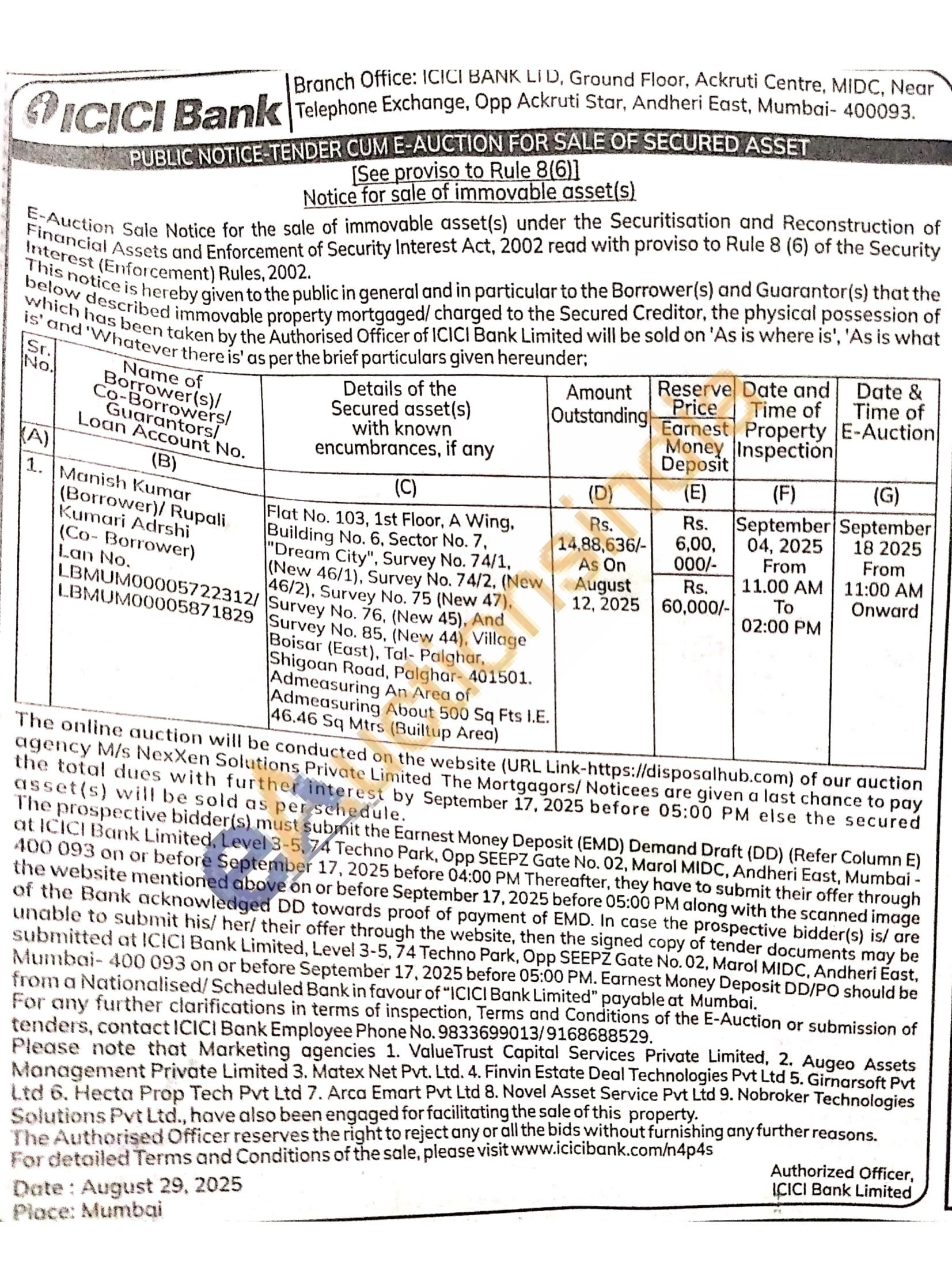 Flat No. 103, 1st Floor, A Wing, Building No. 6, Sector No. 7. "Dream City", Survey No. 74/1, (New 46/1), Survey No. 74/2, (New 46/2), No. 75 (New 47), Survey No. 85. (New 44), Village Boisar (East), Tal-Palghar, Shigoan Road, Palghar-401501. Admeasuring An Area of Admeasuring About 500 Sq Fts I.E. 46.46 Sq Mtrs (Builtup Area)