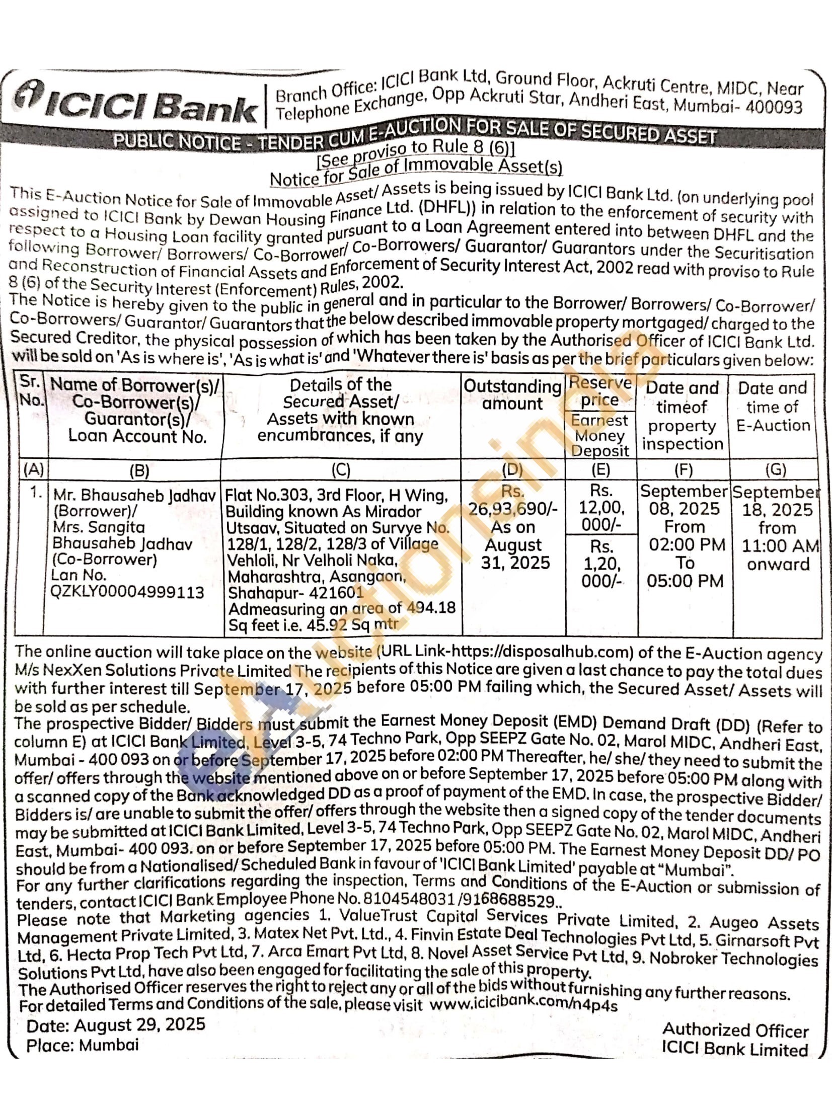 Flat No.303, 3rd Floor, H Wing, Building known As Mirador Utsaav, Situated on Survye No. 128/1, 128/2, 128/3 of Village Vehloli, Nr Velholi Naka, Maharashtra, Asangaon, Shahapur-421601 Admeasuring an area of 494.18 Sq feet i.e. 45.92 Sq mtr
