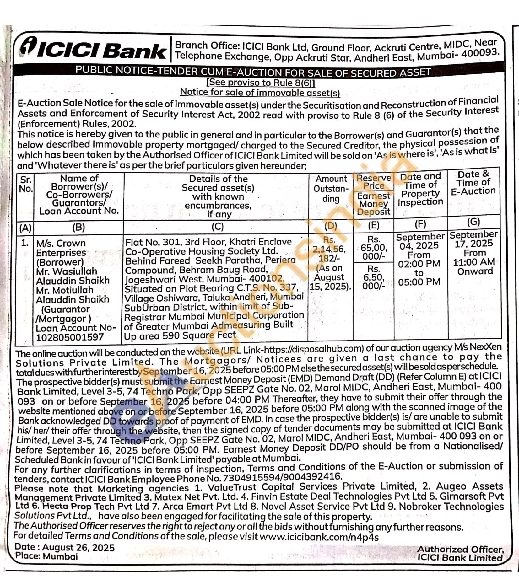 Flat No. 301, 3rd Floor, Khatri Enclave Co-Operative Housing Society Ltd. Behind Fareed Seekh Paratha, Periera Compound, Behram Baug Road, Jogeshwari West, Mumbai-400102, Situated on Plot Bearing C.T.S. No. 337, Village Oshiwara, Taluka Andheri, Mumbai Suburban District, within limit of Sub-Registrar Mumbai Municipal Corporation of Greater Mumbai Admeasuring Built Up area 590 Square Feet