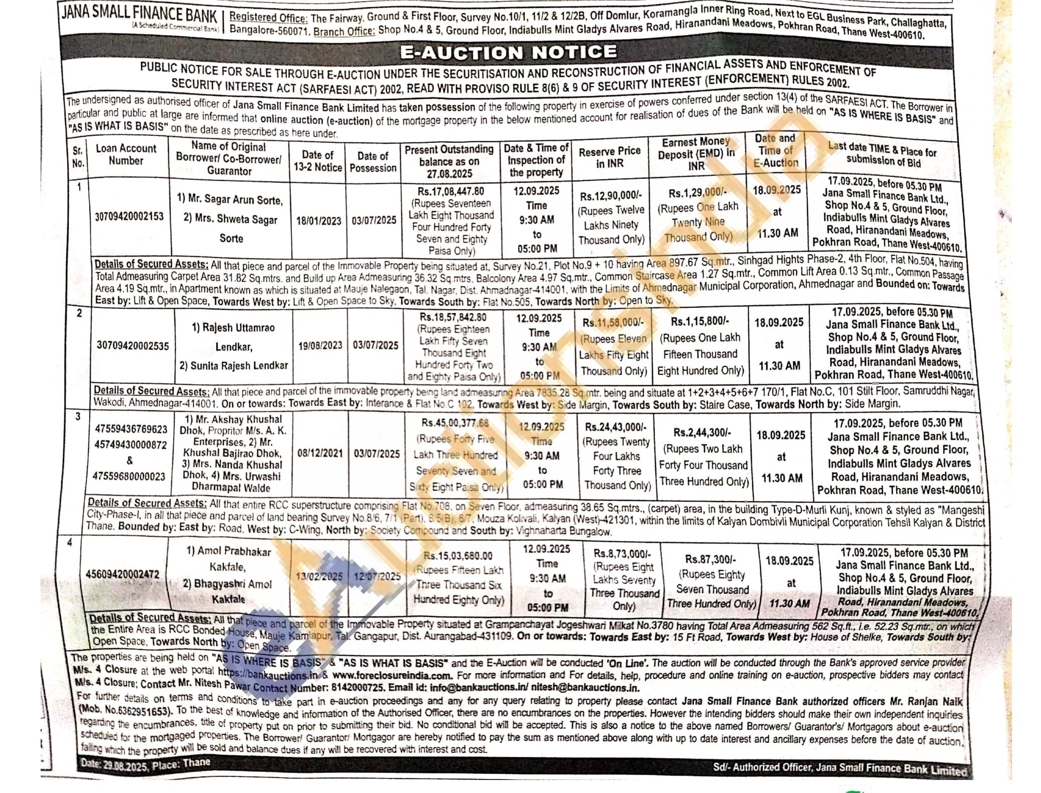 Details of Secured Assets: All that piece and parcel of the immovable property being land admeasuring Area 7835.28 Sq.mtr. being and situate at 1+2+3+4+5+6+7 170/1, Flat No.C, 101 Stilt Floor, Samruddhi Nagar, Wakodi, Ahmednagar-414001. On or towards: Towards East by: Interance & Flat No. C 102. Towards West by: Side Margin, Towards South by: Staire Case, Towards North by: Side Margin