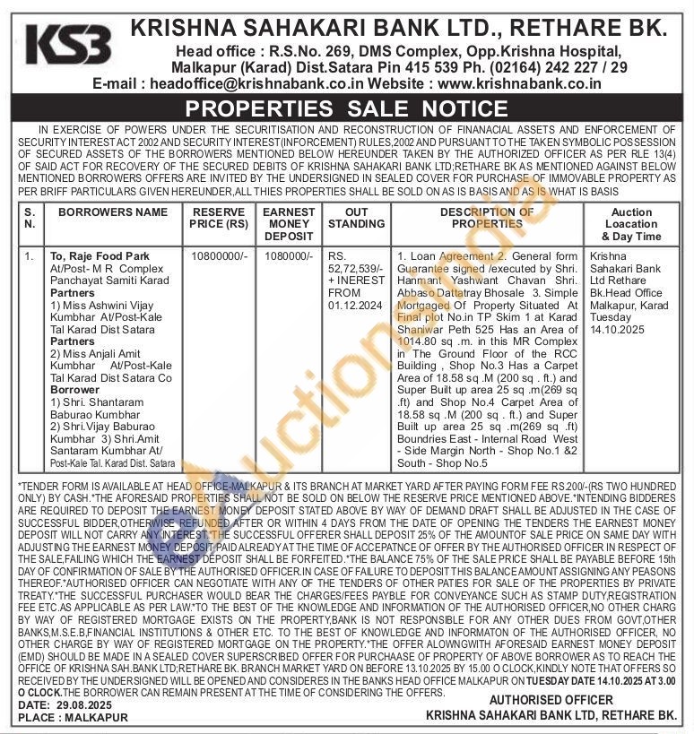 Loan Agreement 2. General form Guarantee signed /executed by Shri. Hanmant Yashwant Chavan Shri. Abbaso Dattatray Bhosale 3. Simple Mortgaged Of Property Situated At Final plot No.in TP Skim 1 at Karad Shaniwar Peth 525 Has an Area of 1014.80 sq.m. in this MR Complex in The Ground Floor of the RCC Building, Shop No.3 Has a Carpet Area of 18.58 sq.M (200 sq. ft.) and Super Built up area 25 sq.m(269 sq ft) and Shop No.4 Carpet Area of 18.58 sq.M (200 sq.ft.) and Super Built up area 25 sq.m(269 sq.ft) Boundries East Internal Road West - Side Margin North Shop No.1 &2 South - Shop No.5