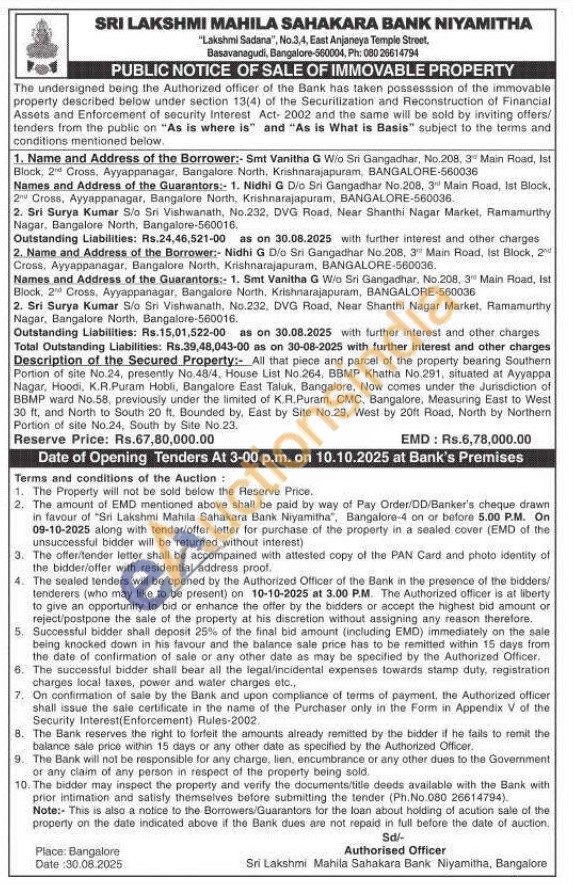 All that piece and parcel of the property bearing Southern Portion of site No.24, presently No.48/4, House List No.264, BBMP Khatha No.291, situated at Ayyappa Nagar, Hoodi, K.R.Puram Hobli, Bangalore East Taluk, Bangalore, Now comes under the Jurisdiction of BBMP ward No.58. previously under the limited of K.R.Puram, CMC, Bangalore, Measuring East to West 30 ft, and North to South 20 ft, Bounded by, East by Site No.29, West by 20ft Road, North by Northern Portion of site No.24, South by Site No.23.