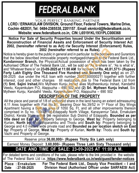 All the piece and parcel of 1/8 of undivided share in the land having an extent admeasuring 4.11 Ares together with Flat No.B1, Bearing Door No.39/52 in 1 Floor of Sky Wings Apartment having a built up area of 1050 Sq. Ft, and all other improvements thereon comprised in Sy no. 109/48, of Edappally North Village, Kanayannur Taluk, Ernakulam District, Kerala State within the registration Sub District of Edappally. Bounded as per title deed on East by: Property belongs to George, West by: Property belonging to Kurian, North by: Mattathiparambu and Thodu and South by: Property belonging to George and 4.0 meters wide private road and Bounded as per location sketch on East by: Property of George, West by: Property of Kurian, North by: Thodu and South by: Vazhi and Property of George.