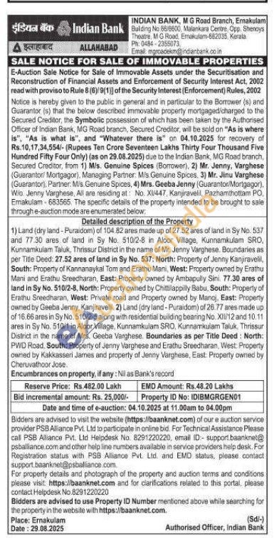 Land (dry land-Puraidom) of 104.82 ares made up of 27.52 ares of land in Sy No. 537 and 77.30 ares of land in Sy No. 510/2-8 in Aloor Village, Kunnamkulam SRO, Kunnamkulam Taluk, Thrissur District in the name of Mr. Jenny Varghese. Boundaries as per Title Deed: 27.52 ares of land in Sy No. 537: North: Property of Jenny Kanjiravelil, South: Property of Kannanaykal Tom and Erathu Mani, West: Property owned by Erathu Mani and Erathu Sreedharan, East: Property owned by Ambapully Sini. 77.30 ares of land in Sy No. 510/2-8, North; Property owned by Chittilappilly Babu, South: Property of Erathu Sreedharan, West: Private road and Property owned by Manoj, East: Property owned by Geeba Jenny, Kanjiravell. 2) Land (dry land-Puraidom) of 26.77 ares made up of 16.66 ares in Sy No. 510/2-5 along with residential building bearing No. XII/12 and 10.11 ares in Sy No. 510/1 in Aloor Village, Kunnamkulam SRO, Kunnamkulam Taluk, Thrissur District in the name of Mrs. Geeba Varghese. Boundaries as per Title Deed: North: PWD Road. South: Property of Jenny Varghese and Erathu Sreedharan, West: Property owned by Kakkasseri James and properly of Jenny Varghese, East. Property owned by Cheruvathoor Jose.
