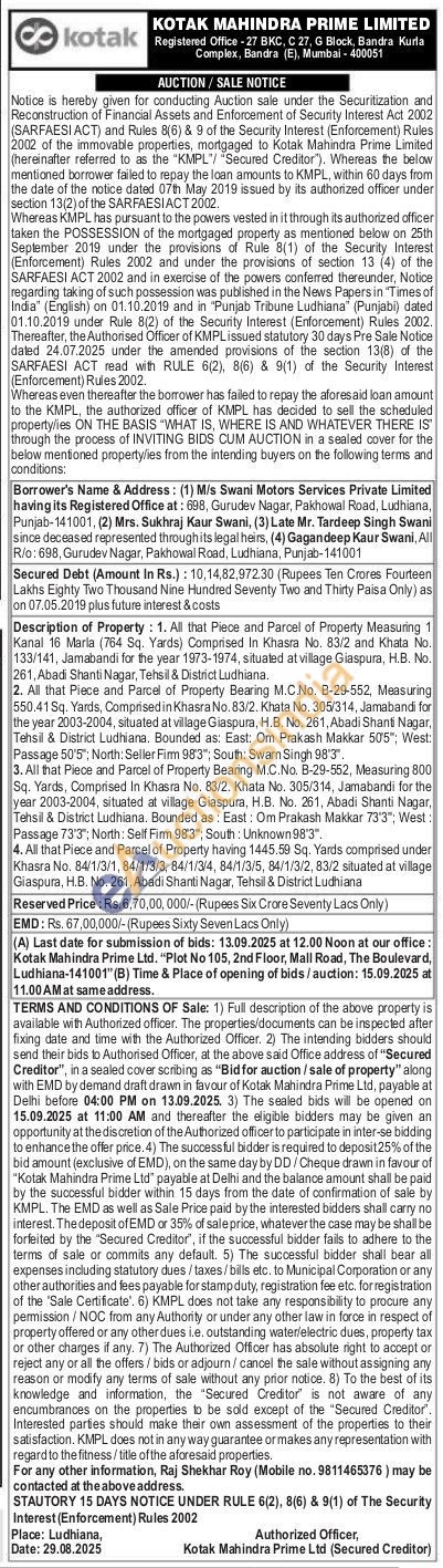 All that Piece and Parcel of Property Measuring Kanal 16 Marla (764 Sq. Yards) Comprised In Khasra No. 83/2 and Khata No 133/141, Jamabandi for the year 1973-1974, situated at village Giaspura, HB No. 261, Abad Shanti Nagar, Tehsil & District Ludhiana. 2. All that Piece and Parcel of Property Bearing M.CNo. 8-29-552, Measuring 550.41 Sq. Yards, Comprised in Khasra No. 83/2 Khata No. 305/314, Jamaband for the year 2003-2004, situated at village Giaspura, H.B. No. 261, Abadi Shani Nagar, Tehsil & District Ludhiana Bounded as: East Om Prakash Makkar 505" West Passage 506: North Seller Firm 983" South: Swan Singh 98'3" 3. All that Piece and Parcel of Property Bearing M.C.No. B-29-552, Measuring 800 Sq. Yards, Comprised In Khasra No. 83/2 Khata No. 305/314, Jamabandi for the year 2003-2004, situated at village Giaspura, H.B. No. 261, Abadi Shanti Nagar Tehsil & District Ludhiana Bounded as East: Om Prakash Makkar 73'3" West Passage 73'3"; North: Self Fim 983", South: Unknown 983" 4. All that Piece and Parcel of Property having 1445.59 Sq. Yards composed under Khasra No. 84/1/3/1, 84/1/3/3, 84/1/3/4, 84/1/3/5, 84/1/3/2, 83/2 situated at village Giaspura, H.B. No. 261, Abadi Sharti Nagar, Tehsil & District Ludhiana