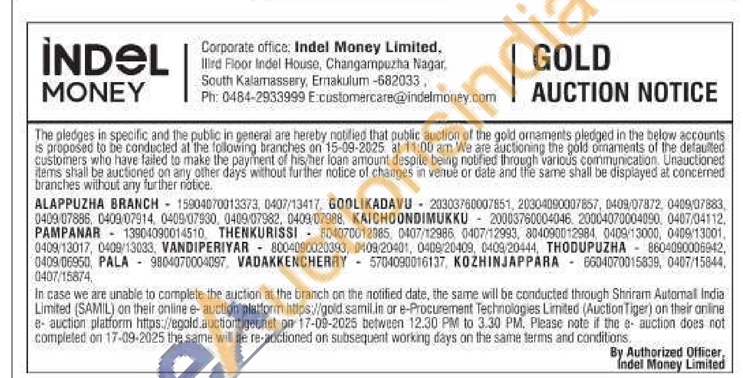 Indel money ltd Gold Auctions Auction in Alappuzha