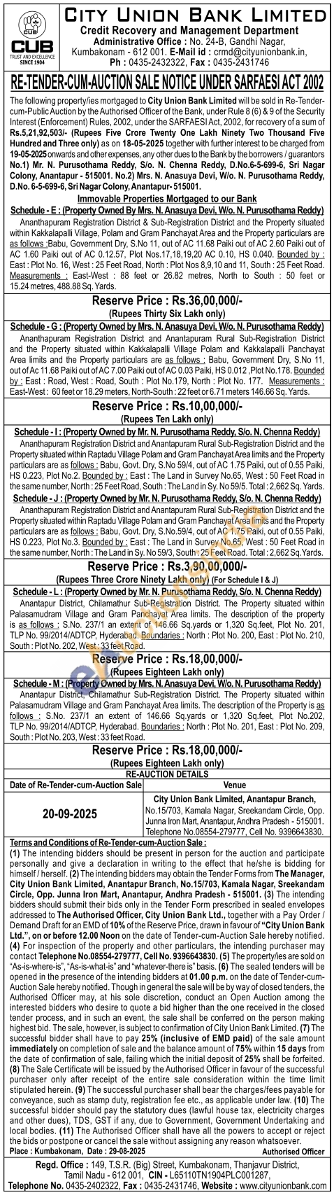 Schedule-1: (Property Owned by Mr. N. Purusothama Reddy, Slo. N. Chenna Reddy) Ananthapuram Registration District and Anantapuram Rural Sub-Registration District and the Property started within Raptadu Village Polam and Gram Panchayat Area limits and the Property particulars are as follows: Babu Govt. Dry. S. No 5814, out of AC 1.75 Paiki, out of 0.55 Paiki HS 0.225. Plot No.2. Bounded by: East: The Land in Survey No. 85. West: 50 Feet Road in the same number North: 25 Feet Road, South: The Land in Sy No 595. Total: 2,662 Sq. Yards Schedule-J: (Property Owned by Mr. N. Purusothama Reddy, Sio. N. Chenna Reddy) Ananthapuram Registration District and Anantapuram Rural Sub-Registration District and the Property situated within Raptadu Village Polam and Gram Panchayat Ares limits and the Property particulars are as folizes, Babu, Govt. Dry, S. No 5814, out of AC 1.75 Palki, out of 0.55 Paiki HS 0.223, Plot No.3. Bounded by: East: The Land in Survey No.65, West: 50 Feet Road in same number. North: The Land in Sy. No fi93, South: 25 Feet Road. Total: 2,662 Sq. Yards