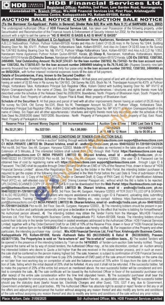 Survey No. 53/5, Block No. 14, Thandapper Account No 4379, at Puthoor Village, Kottarakara Taluk, Kottarakara Principal Sub Registrar Office, Kollam District with building bearing Door No MP XIV:12 at Mylom Gramapanchayath in the name of Dileep, Sio Rajan and all other appurtenances/structures and rights thereto more fully described under the schedule of the Release Deed No. 2036/2014, Boundaries North: Property of Bhaskaran Asari, South: Property of Dileep & Road, East: Property of Lathakumari, Vijayan Pillai & Road, West: property of Bhaskaran Asari, Schedule of the Securities II: All that piece and parcel of land with all other improvements therein having an extent of 05.26 Ares in File survey No.124/4, Old Survey No.53/5, Block No. 14, Thandapper Account No.3321, at Puthoor Village, Kottarakara Taluk, Kottarakara Principal Sub Registrar Office, Kollam District with building bearing Door No. MP XIV/11 at Mylom Gramapanchayath in the name of Dileep. Sio Rajan and all other appurtenances/structures and rights thereto more fully described under the schedule of the Sale Deed No.2558/2006 dated 19/07/2006. Boundaries North Property of Pankajakshi Amma, South: property of Saji, East Road, West Property of Pankajakshi Amma