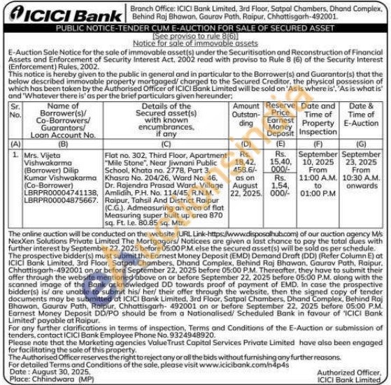 Flat no. 302, Third Floor, Apartment "Mile Stone". Near Jiwnani Public School, Khata no. 2778, Part 3. Khasra No. 204/26, Ward No. 46, Dr. Rajendra Prasad Ward, Village Amlidih, P.H. No. 114/45, R.N.M. Roipur, Tahsil And District Raipur (C.G.). Admeasuring an area of flat Measuring super built up area 870 sq. Ft. l.e. 80.85 sq. Mtr.