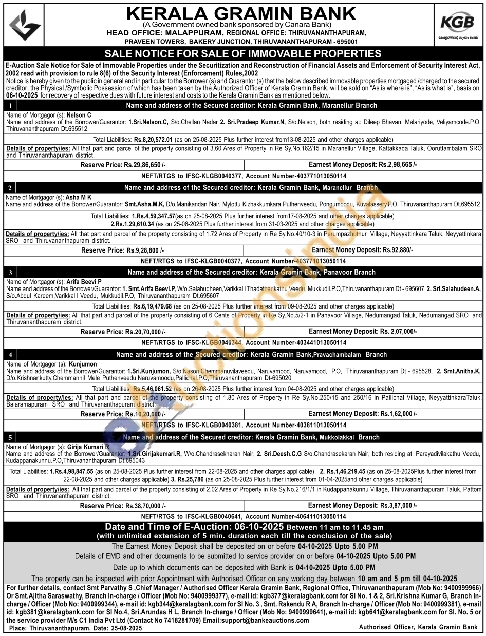 Contact : Mob No: 9400999966) Or Smt. Ajitha Saraswathy, Branch In-charge/Officer (Mob No: 9400999377),