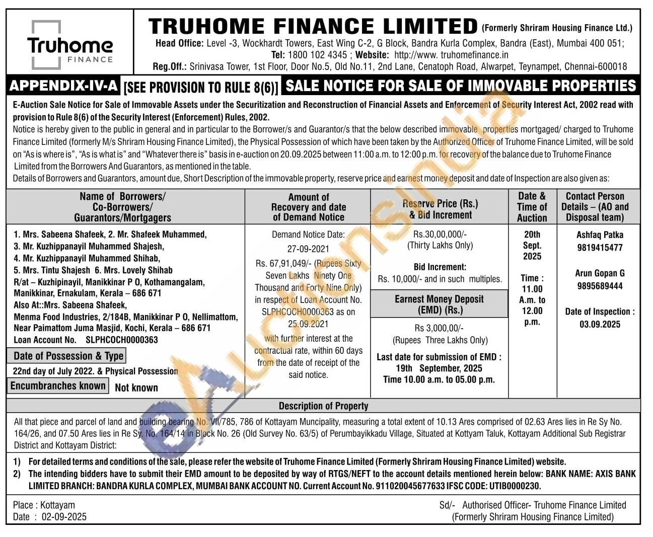 All that piece and parcel of land and building bearing No. VII/785, 786 of Kottayam Muncipality, measuring a total extent of 10.13 Ares comprised of 02.63 Ares lies in Re Sy No. 164/26, and 07.50 Ares lies in Re Sy. No. 164/14 in Block No. 26 (Old Survey No. 63/5) of Perumbayikkadu Village, Situated at Kottyam Taluk, Kottayam Additional Sub Registrar District and Kottayam District: