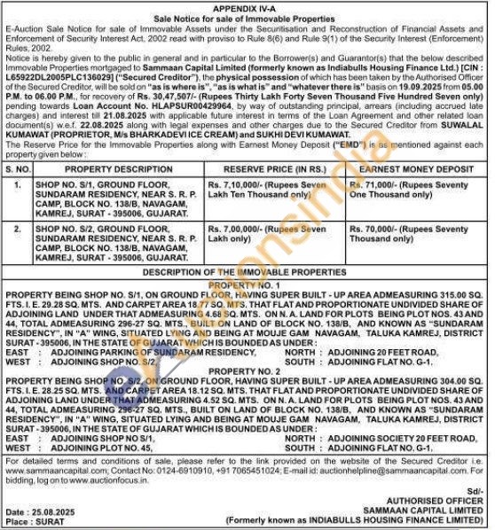 PROPERTY BEING SHOP NO. S/1, ON GROUND FLOOR, HAVING SUPER BUILT-UP AREA ADMEASURING 315.00 SQ. FTS. I. E. 29.28 SQ. MTS. AND CARPET AREA 18.77 SQ. MTS, THAT FLAT AND PROPORTIONATE UNDIVIDED SHARE OF ADJOINING LAND UNDER THAT ADMEASURING 4.68 SQ. MTS. ON N. A. LAND FOR PLOTS BEING PLOT NOS. 43 AND 44, TOTAL ADMEASURING 296-27 SQ. MTS., BUILT ON LAND OF BLOCK NO. 138/B, AND KNOWN AS "SUNDARAM RESIDENCY", IN "A" WING, SITUATED LYING AND BEING AT MOUJE GAM NAVAGAM, TALUKA KAMREJ, DISTRICT SURAT-395006, IN THE STATE OF GUJARAT WHICH IS BOUNDED AS UNDER: EAST ADJOINING PARKING OF SUNDARAM RESIDENCY, WEST ADJOINING SHOP NO. S/2, NORTH ADJOINING 20 FEET ROAD, SOUTH ADJOINING FLAT NO. G-1.