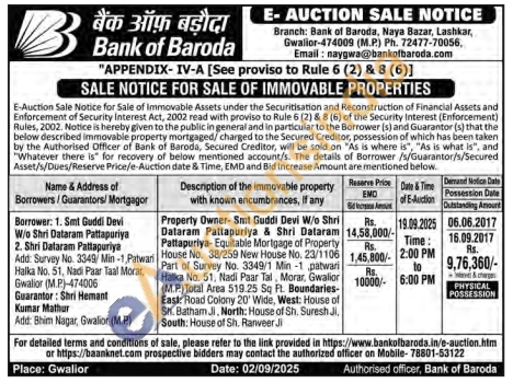 Property Owner-Smt Guddi Devi W/e Shri Dataram Pattapuriya & Shri Dataram Pattapuriya-Equitable Mortgage of Property House No. 38/259 New House No. 23/1106 Part of Survey No. 3349/1 Min-1 patwari Halka No. 51. Nadi Paar Tal, Morar, Gwalior (M.P)Total Area 519.25 Sq Ft. Boundaries-East: Road Colony 20' Wide, West: House of Sh. Batham II, North: House of Sh. Suresh Ji, South: House of Sh. Ranveer Ji