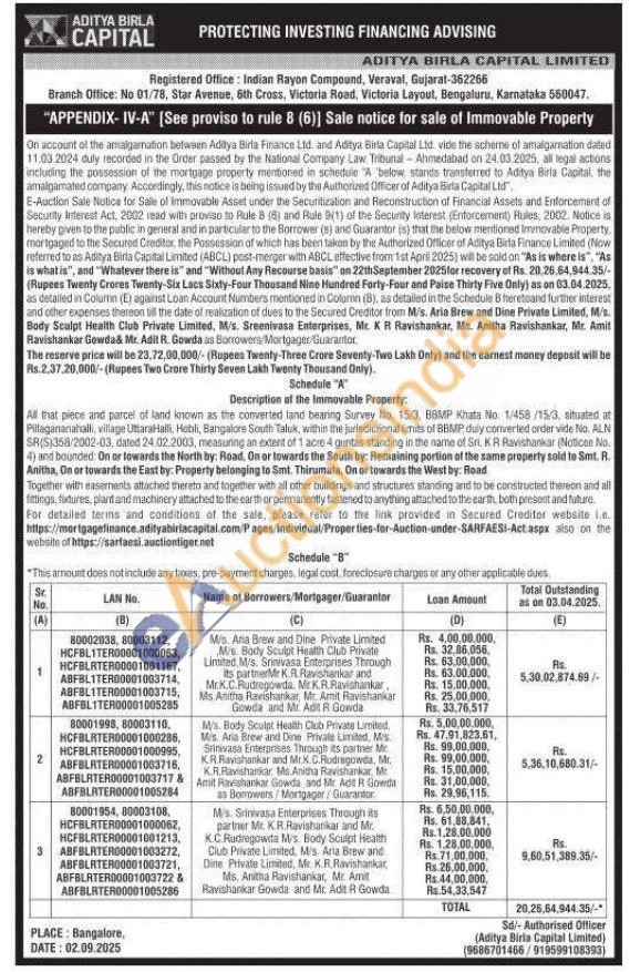 All that piece and parcel of land known as the converted land bearing Survey No. 15/3, BBMP Khata No. 1/458/15/3, situated at Pillagananahalli, village UttaralHalli, Hobili, Bangalore South Taluk, within the jurisdictional limits of BBMP duly converted order vide No. ALN SR(S)358/2002-03, dated 24.02.2003, measuning an extent of 1 acre 4 guntas standing in the name of Sri. KR Ravishankar (Noticee No. 4) and bounded: On or towards the North by: Road, On or towards the South by: Remaining portion of the same property sold to Smt. R. Anitha, On or towards the East by: Property belonging to Smt. Thirumala, On or towards the West by: Road Together with easernents attached thereto and together with all other buildings and structures standing and to be constructed thereon and all fittings, fixtures, plant and machinery attached to the earth or permanently fastened to anything attached to the earth, both present and future. For detailed terins and conditions of the sale, please refer to the link provided in Secured Creditor website l.n. also on the website of https://sarfaesi.auctiontiger.net https://mortgagefinance.adityabiriacapital.com/Pages/Individual/Properties-for-Auction-under-SARFAESI-Act.aspx Schedule "B" *This amount does not include any laxes, pre-payment charges, legal cost foreclosure charges or any other applicable dues