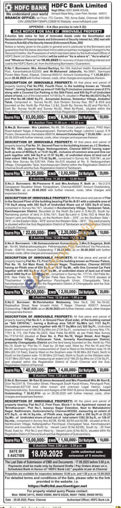 5) All that piece and parcel of property bearing Flat No.G-1, in Ground Floor (East side), of the building named as "SAI CRYSTAL", having a Built-up area 105.07 Sq.Mtrs (or) 1131 Sq.Ft. (including common area) together with 48.77 Sq.Mtrs (or) 525 Sq.Ft., Undivided share of land in out of 198.25 Sq.Mtrs (or) 2134 Sq. Ft, comprised in Survey Nos. 174, 175/1 & 173, Old Patta No.2423, New Patta No.8638, as per Patta New Survey No. 173/1A1A3 situated at Door No. 4, Plot No.18, Vaigai Street, Arul Nagar, Anakaputhur Village, Pallavaram Taluk, formerly Kancheepuram District, presently Chengalpattu District and the land being bounded on the North by-Plot No.19. South by- Plot No. 17, East by- 20 feet road, West by- Plot No.16 and Plot No.20, and having a linear measurement of; East to West on the Northern side-19.35 Mirs (63.1/2 Feet), East to West on the Southern side-18.90 Mtrs (62 Feet), North to South on the Eastern side-10.06 Mtrs (33 Feet), North to South on the Western side-10.67 Mtrs (35 Feet). In all measuring an extent of of 198.25 Sq.Mtrs (or) 2134 Sq.Ft. and situated within the Registration District of South Chennai and the Sub- Registration District of Pammal.