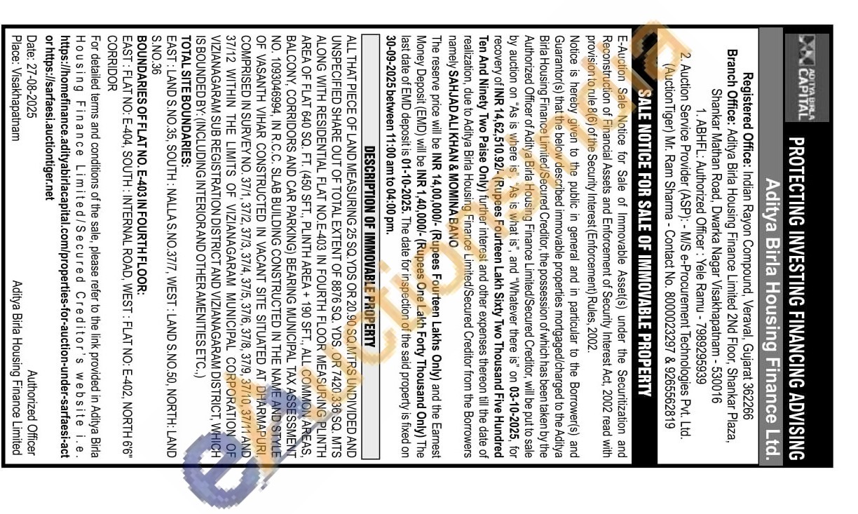 ALL THAT PIECE OF LAND MEASURING 25 SQ.YDS OR 20.90 SQ.MTRS UNDIVIDED AND UNSPECIFIED SHARE OUT OF TOTAL EXTENT OF 8876 SQ. YDS. OR 7420.336 SQ. MTS ALONG WITH RESIDENTIAL FLAT NO.E-403 IN FOURTH FLOOR MEASURING PLINTH AREA OF FLAT 640 SQ. FT. (450 SFT., PLINTH AREA + 190 SFT., ALL COMMON AREAS, BALCONY, CORRIDORS AND CAR PARKING) BEARING MUNICIPAL TAX ASSESSMENT ΝΟ. 1093046994, IN R.C.C. SLAB BUILDING CONSTRUCTED IN THE NAME AND STYLE OF VASANTH VIHAR CONSTRUCTED IN VACANT SITE SITUATED AT DHARMAPURI, COMPRISED IN SURVEY NO. 37/1, 37/2, 37/3, 37/4, 37/5, 37/6, 37/8, 37/9, 37/10, 37/11 AND 37/12 WITHIN THE LIMITS OF VIZIANAGARAM MUNICIPAL CORPORATION OF VIZIANAGARAM SUB REGISTRATION DISTRICT AND VIZIANAGARAM DISTRICT, WHICH IS BOUNDED BY: (INCLUDING INTERIOR AND OTHER AMENITIES ETC.,)