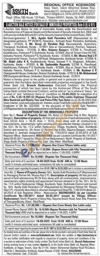 Item No.1: Name of Property Owner: Mr. Ibrayi Ebrahim Haji & Mrs. Najuma Beegem, Description of property: All that part and parcel of land admeasuring 70.41 Ares (20.63 Ares 30.35 Ares + 19.43 Ares) along with all constructions, improvements, easementary rights existing and appurtenant thereon situated in Sy No. 53/1, Re Sy No. 17/2 within Naduvannur Village, Koyilandy Taluk, Kozhikode District and owned by Mr. Ibrayi Ebrahim Haji & Mrs. Najuma Beegam, morefully described in Jenmam Assignment Deed No. 1193/2010 dated 22-04-2010 of Sub Registrar Office-Naduvannur. BOUNDARIES (as per Location Certificate No. 191/2017 dated 08.05.2017 issued by Village Officer-Naduvannur): North: Property of Santhosh, Shyja, South: Property of Moosa Haji, East: Eda, West: Mud Road